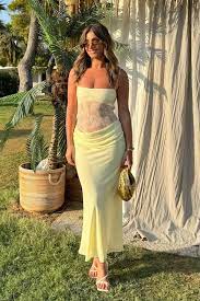 Un tocco di eleganza e leggerezza: l' abito lungo Halo crea una silhouette naturale e femminile con un tessuto fluido e leggermente elasticizzato in un delicato giallo limone. Il pizzo sottile in vita crea un look moderno e sensuale. Con spalline regolabili, cintura alta e chiusura nascosta, è leggero, aderente ed elegante .